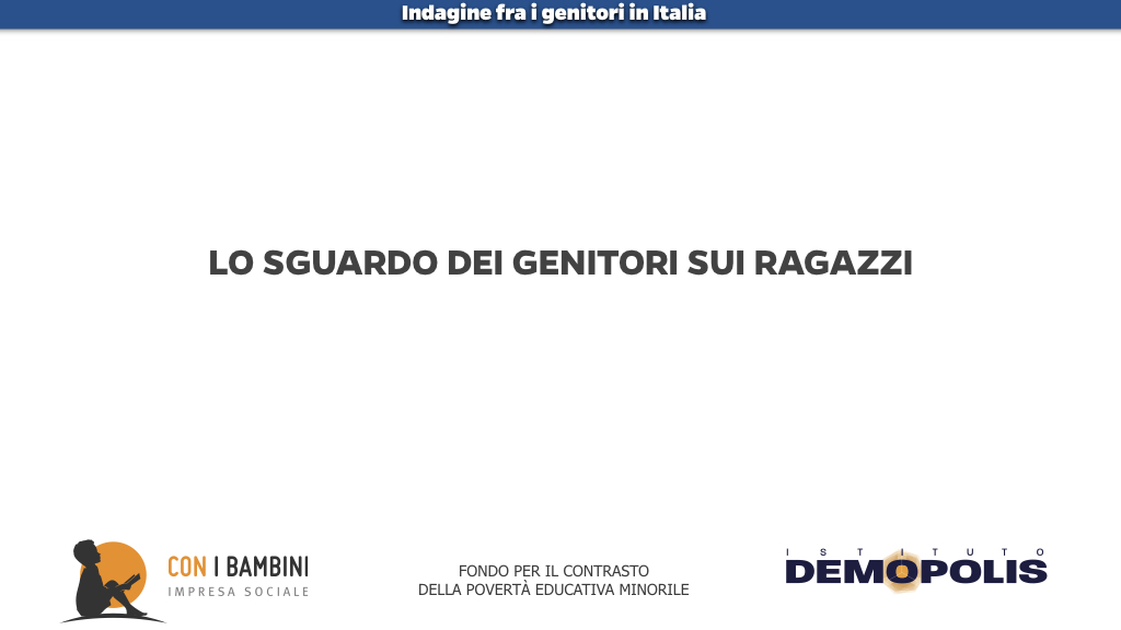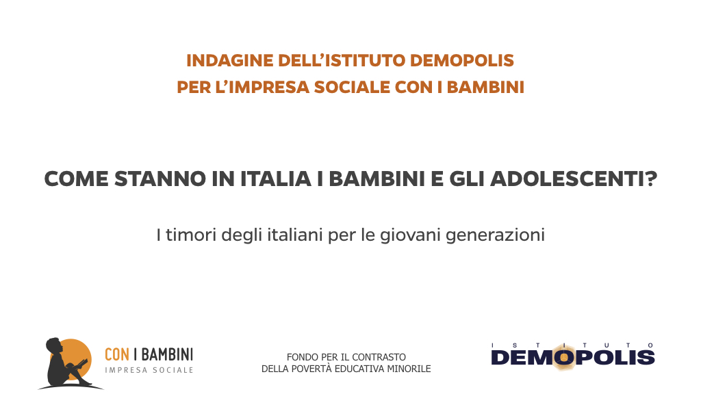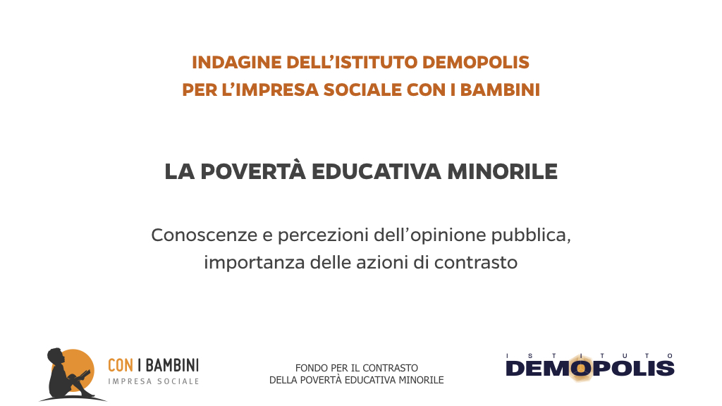 L’indagine è stata condotta dall’Istituto Demopolis, diretto da Pietro Vento, per l’impresa sociale Con i Bambini, nell’ambito del Fondo per il contrasto della povertà educativa minorile, su un campione nazionale stratificato di 4.080 intervistati, statisticamente rappresentativo dell’universo della popolazione italiana maggiorenne, integrato da un focus sui genitori con figli minorenni.