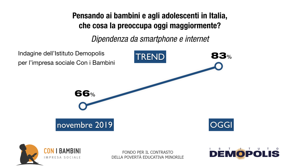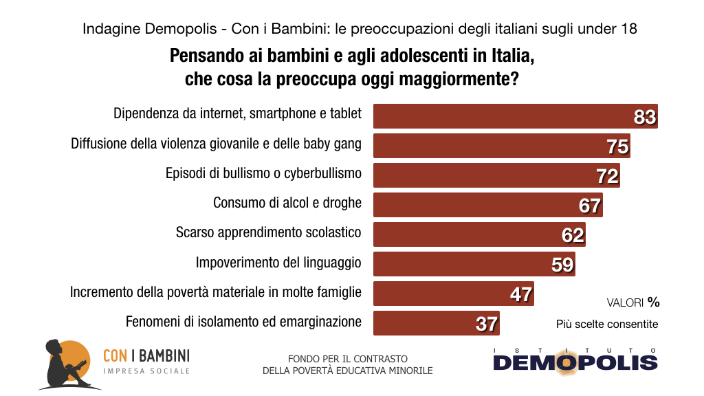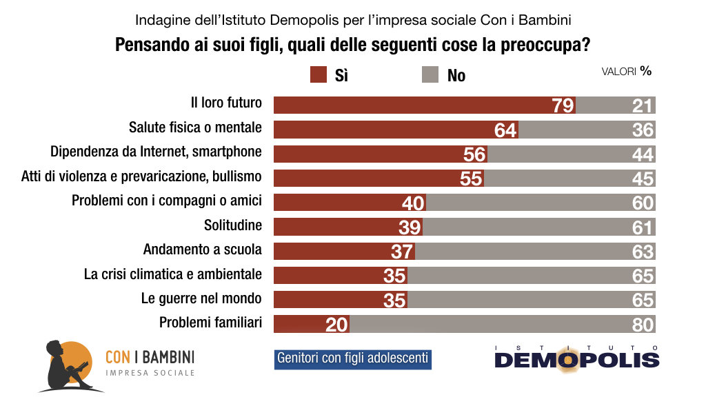 Quasi 8 genitori su 10 temono per il futuro dei loro figli. Il 64% per la loro salute fisica o mentale. L’83% degli italiani adulti è preoccupato dalla dipendenza degli adolescenti da internet, smartphone e tablet.