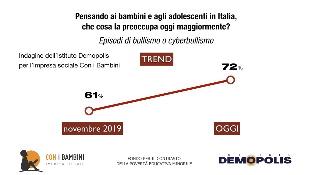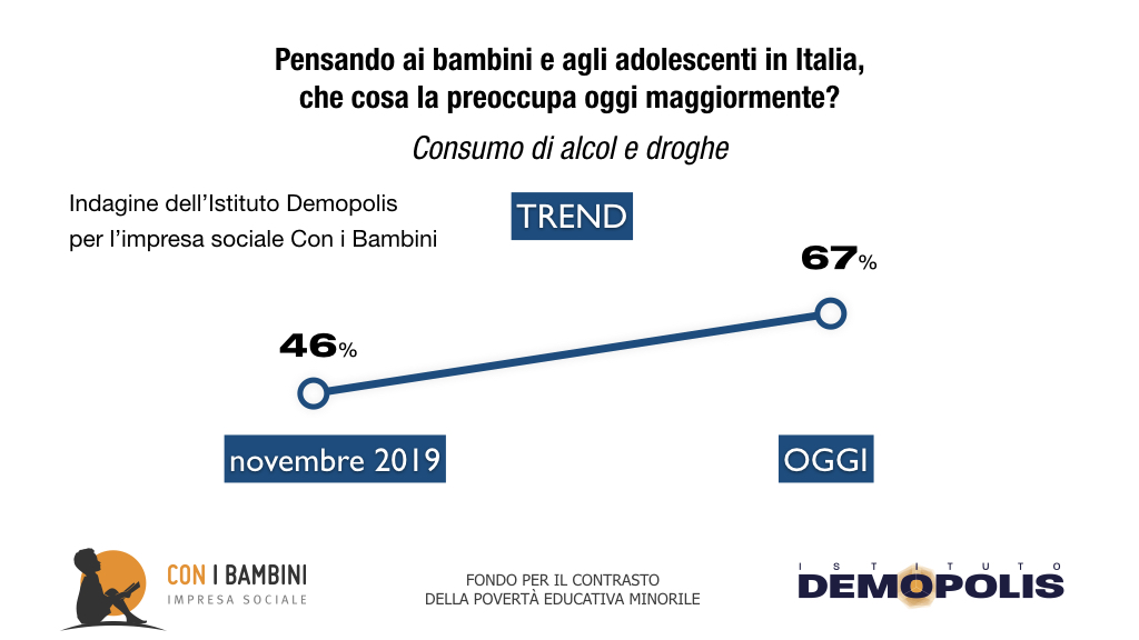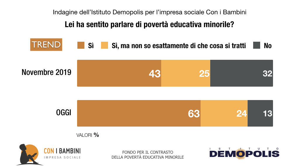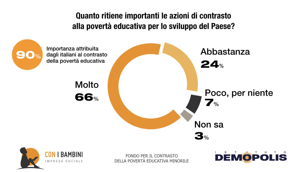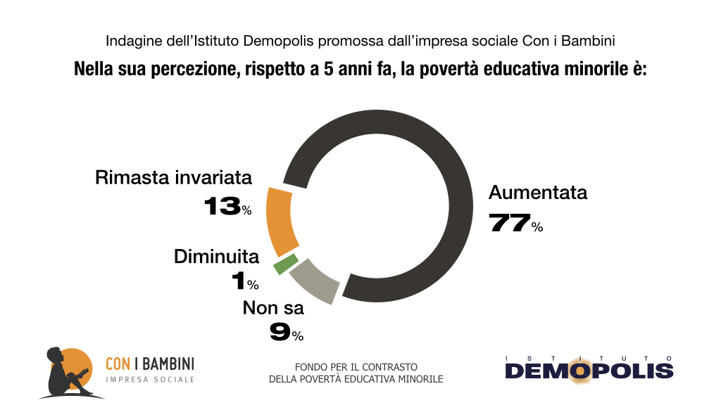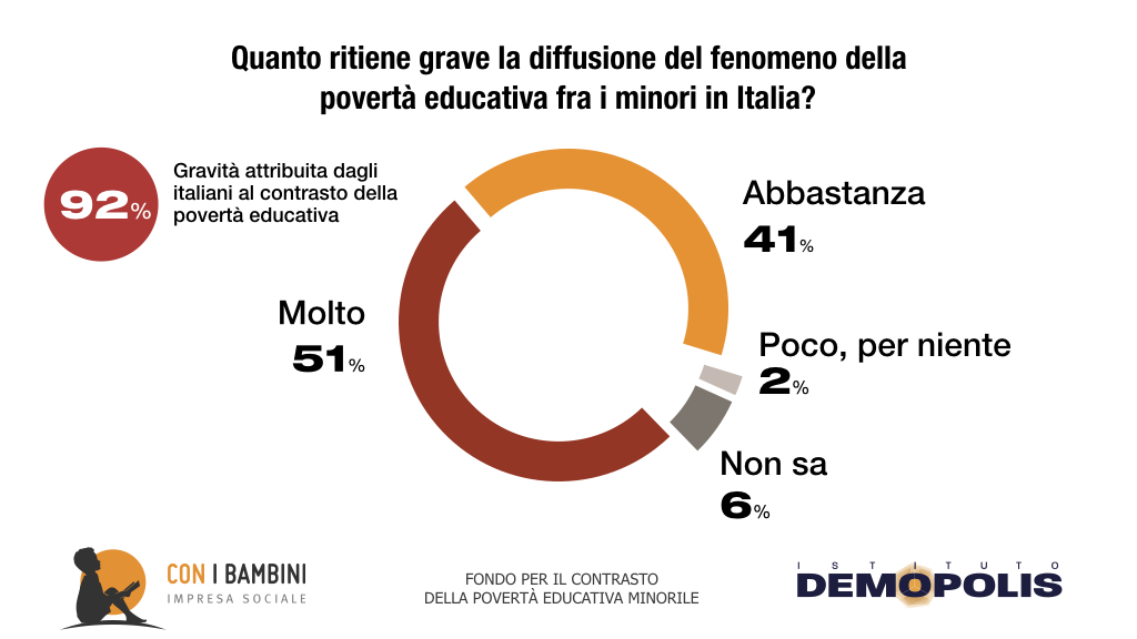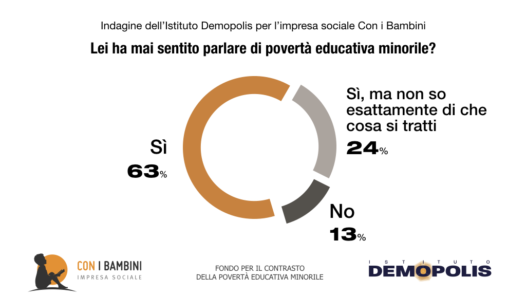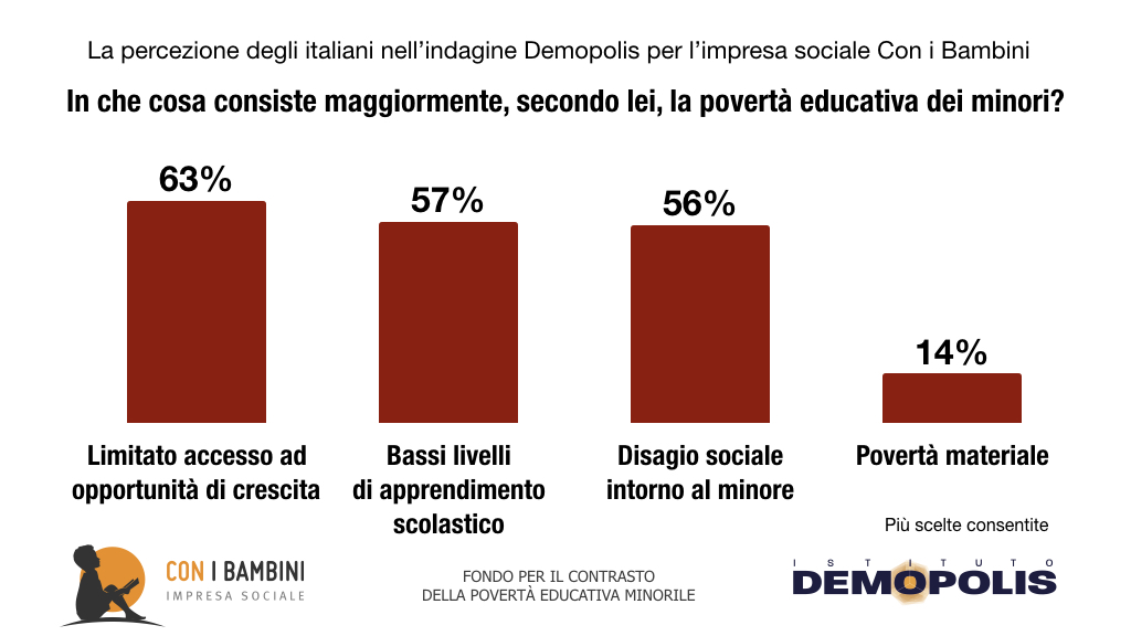Inoltre, secondo la ricerca Demopolis-Con i Bambini, il 63% individua la povertà educativa come “limitato accesso ad opportunità di crescita”. Il 57% la assimila a bassi livelli di apprendimento scolastico, mentre il 56% cita il disagio sociale intorno al minore.