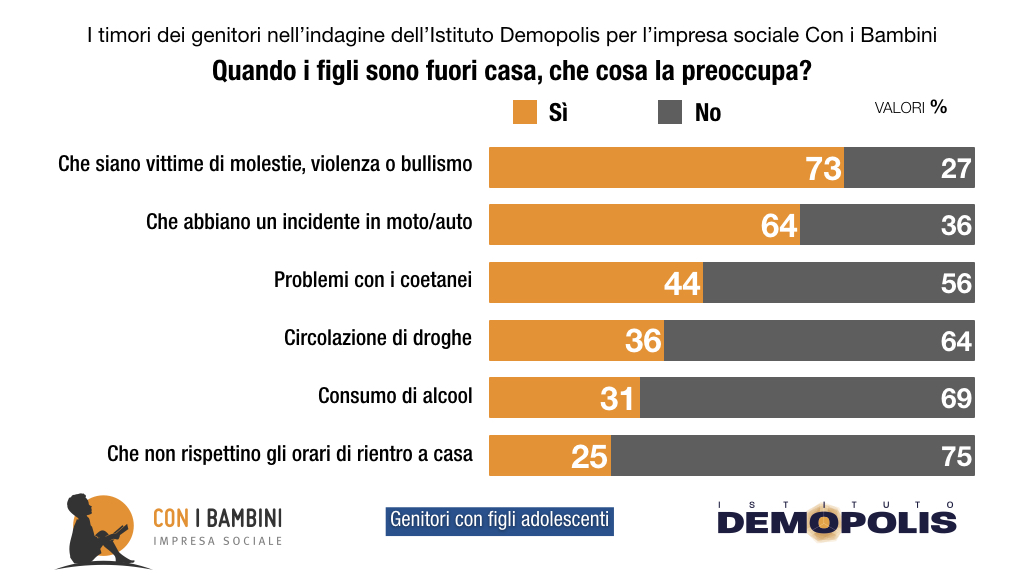 Il quadro cambia se si chiede ai genitori di indicare i timori che provano quando i figli sono fuori casa. Il 73% teme che, quando escono, possano essere vittime di episodi di violenza o bullismo; il 64% esprime inoltre paura per possibili incidenti stradali. Preoccupano in dimensione significativa ma più ridotta gli eventuali problemi con i coetanei (44%), la circolazione di droghe (36%), il consumo di alcol (31%).
