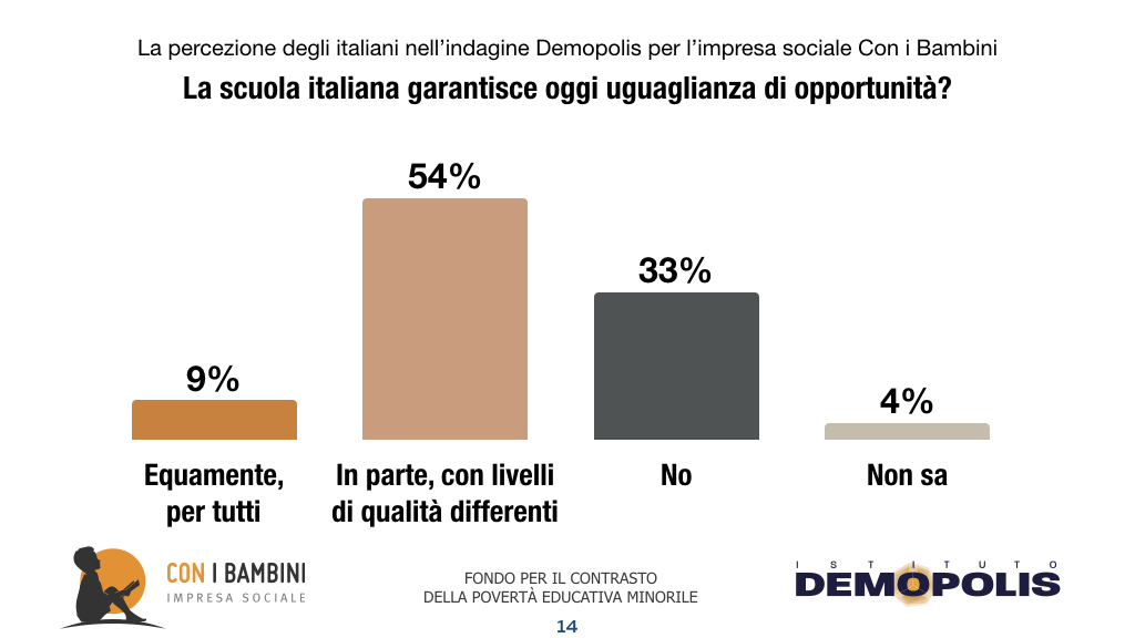 “Gli italiani – spiega il direttore dell’Istituto Demopolis Pietro Vento – ritengono che le opportunità dell’istruzione non siano oggi garantite equamente per tutti nel nostro Paese: spesso con livelli di qualità differenti e con forti divari, anche in seno ai medesimi contesti regionali e urbani. Appena il 9% crede che la scuola assicuri occasioni eque per tutti”.