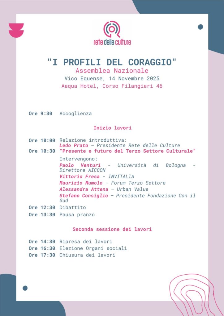 ROMA, 7 NOVEMBRE 2025. A circa tre anni dalla costituzione dell’Associazione Rete delle Culture, il 14 novembre a Vico Equense (NA), si terrà l’Assemblea Nazionale per fare il punto sulle attività svolte e gli obiettivi su cui lavorare nei prossimi mesi.