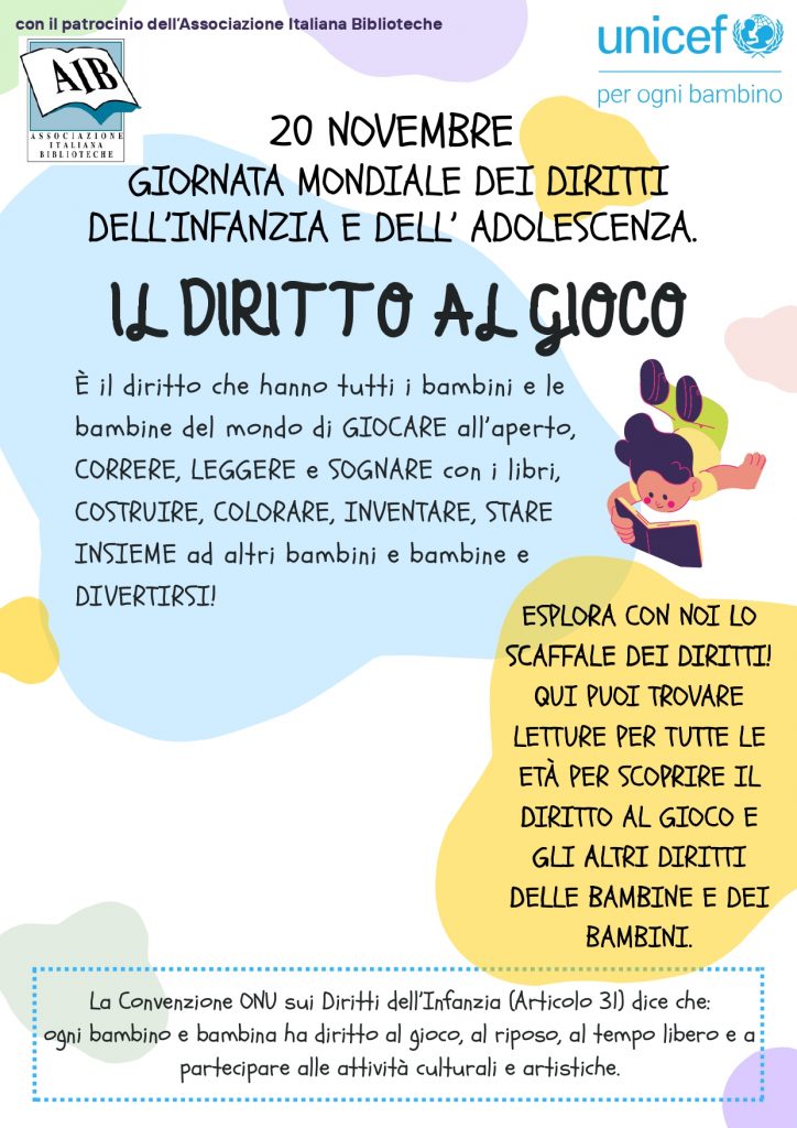 ·         Iniziativa con le Biblioteche: nell’ambito del protocollo d’Intesa con l’Associazione Italiana Biblioteche, l’UNICEF Italia ha invitato le biblioteche a celebrare la giornata e a predisporre uno scaffale dedicato ai Diritti dell’Infanzia e dell’Adolescenza e la possibilità di realizzare una lettura o un laboratorio dedicato ai Diritti dei bambini, con particolare attenzione al Diritto al gioco. (LOCANDINA di seguito)