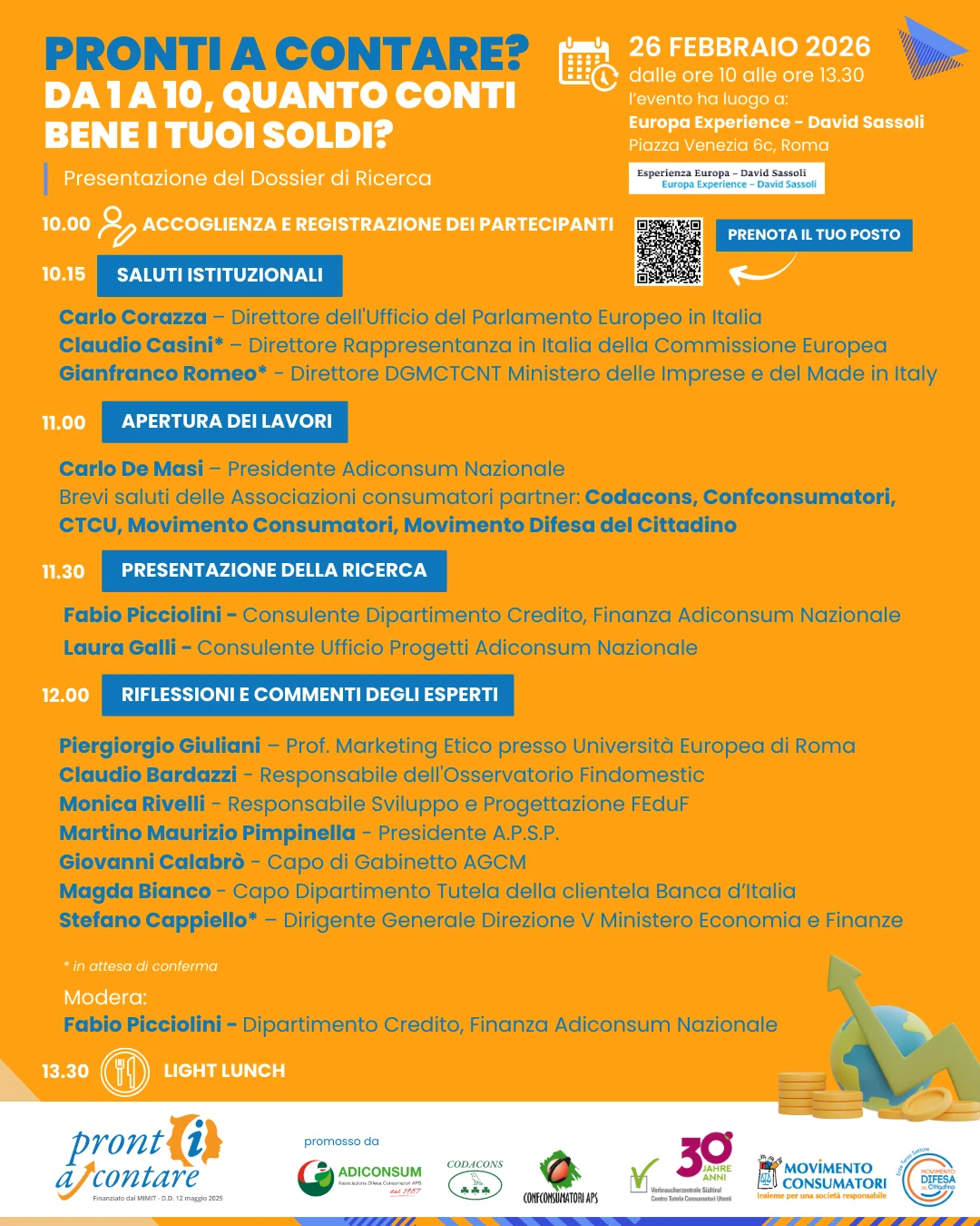 I risultati derivanti dall’analisi dei questionari verranno presentati al convegno “PRONTI A CONTARE? Da 1 a 10, quanto conti bene i tuoi soldi?”: