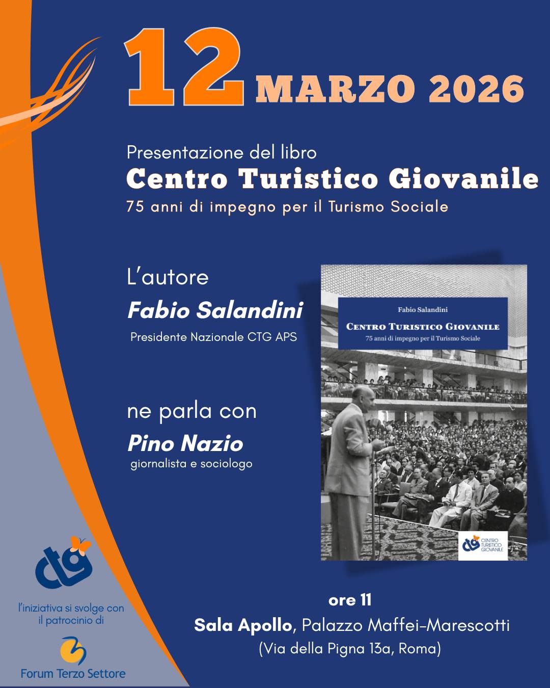 La presentazione si terrà giovedì 12 marzo alle ore 11.00 presso la Sala Apollo di Palazzo Maffei Marescotti, Roma. Durante l’incontro, l’autore dialogherà con Pino Nazio, giornalista e sociologo, per approfondire il valore storico e sociale dell’esperienza del CTG.